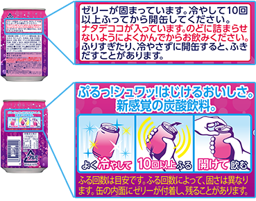 ゼリーが固まっているので、冷やしてパッケージに表示の回数程度ふってから開缶してください。