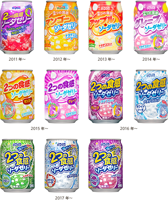 2014年より「2つの食感 ソーダゼリー」を通年販売しています。「2つの食感 ソーダゼリー」は、2011年の発売当初より春夏の商品として販売していましたが、秋冬の商品に切り替わる時期になりますと、終売を惜しむお客様からの声を多数いただきました。そこで、皆様のご要望にお応えし、より多くの方にご愛飲いただけるよう、2014年より販売時期を通年に変更しました。※2018年2月より、「ぷるっシュ!! ゼリー×スパークリング」を発売しています。