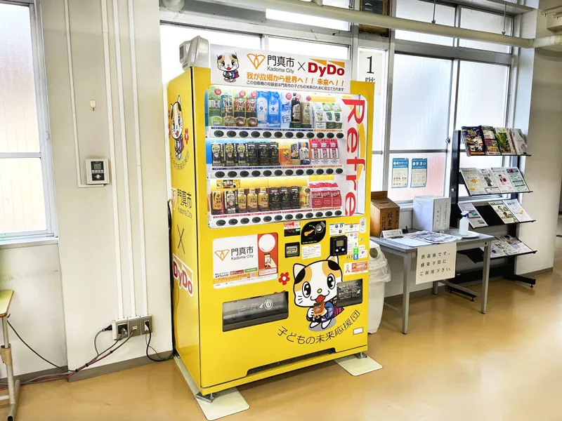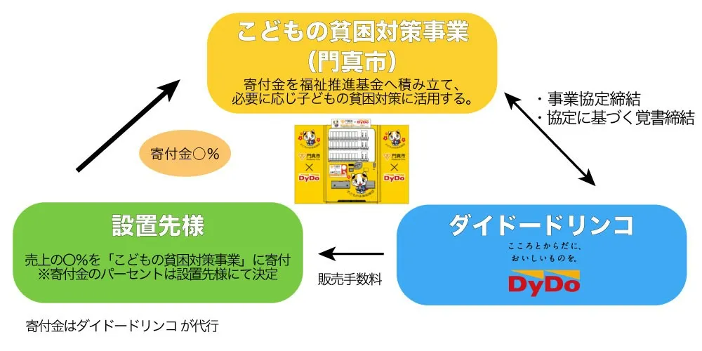 情報発信ベンダーは、門真市が実施する子どもの貧困対策事業の情報を発信する自動販売機です。売上金の一部が門真市に寄付され、