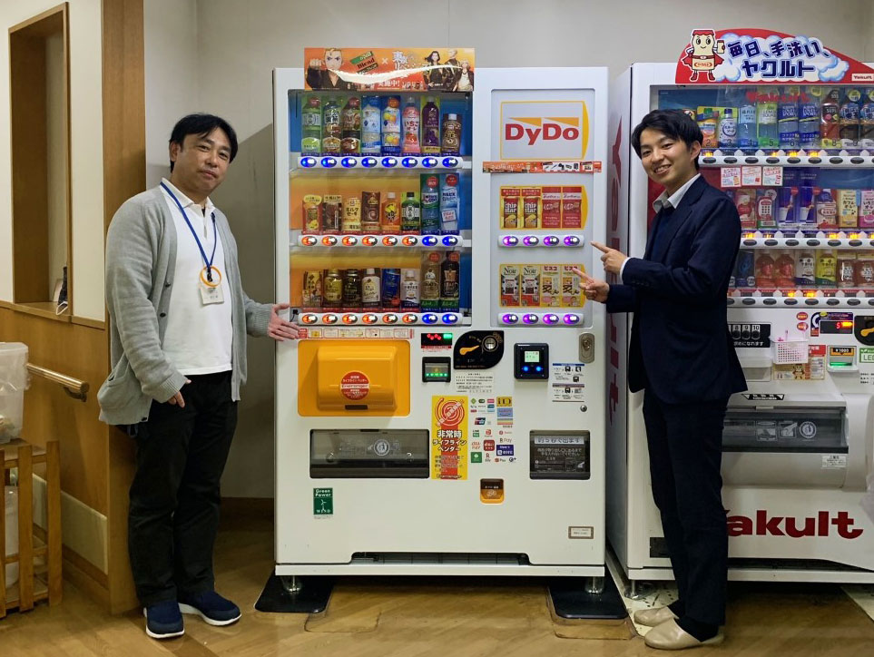 元々自動販売機は2台置いており、うち1台は災害対応の「鍵を開けて取り出すタイプ」でした。今回DyDoさんから「ハンドルを回して自家発電することでバッテリーを復旧するタイプ」をご紹介いただき、携帯電話の充電もできるので便利だと感じました。