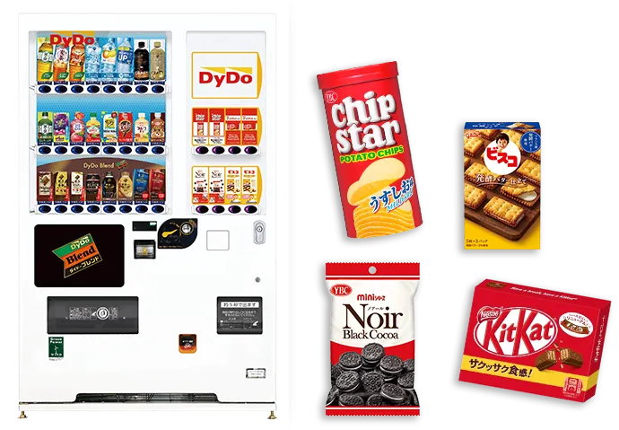 飲料と食品が一緒に販売できる自動販売機を以前見かけたことがあったのでDyDoさんに聞いてみたところ、取り扱いがあるということでコラボレーション自販機をご案内いただきました。