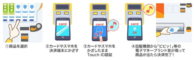 商品選択後、商品が出るまでカードやスマートフォンを決済端末にかざしていただくことでお支払いが完了します。小銭・紙幣の投入やつり銭も発生しないため、スムーズに自動販売機をご利用いただけます。