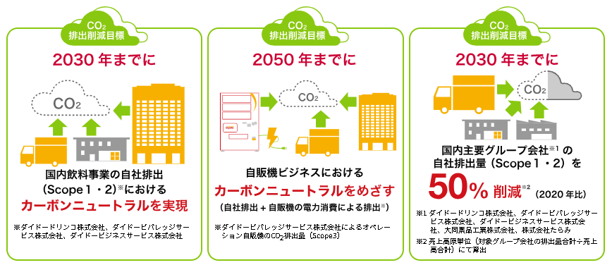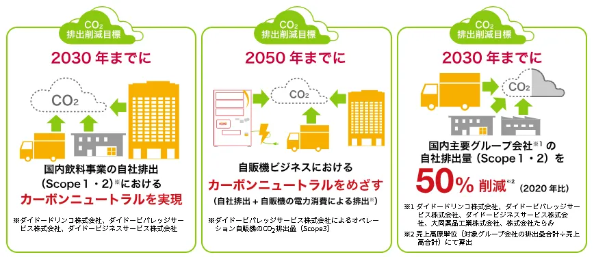 自動販売機の年間消費電力量に相当する再エネ指定の非化石証書を、年に1度ダイドードリンコが代理購入してCO₂の排出量を実質ゼロにする仕組みです。