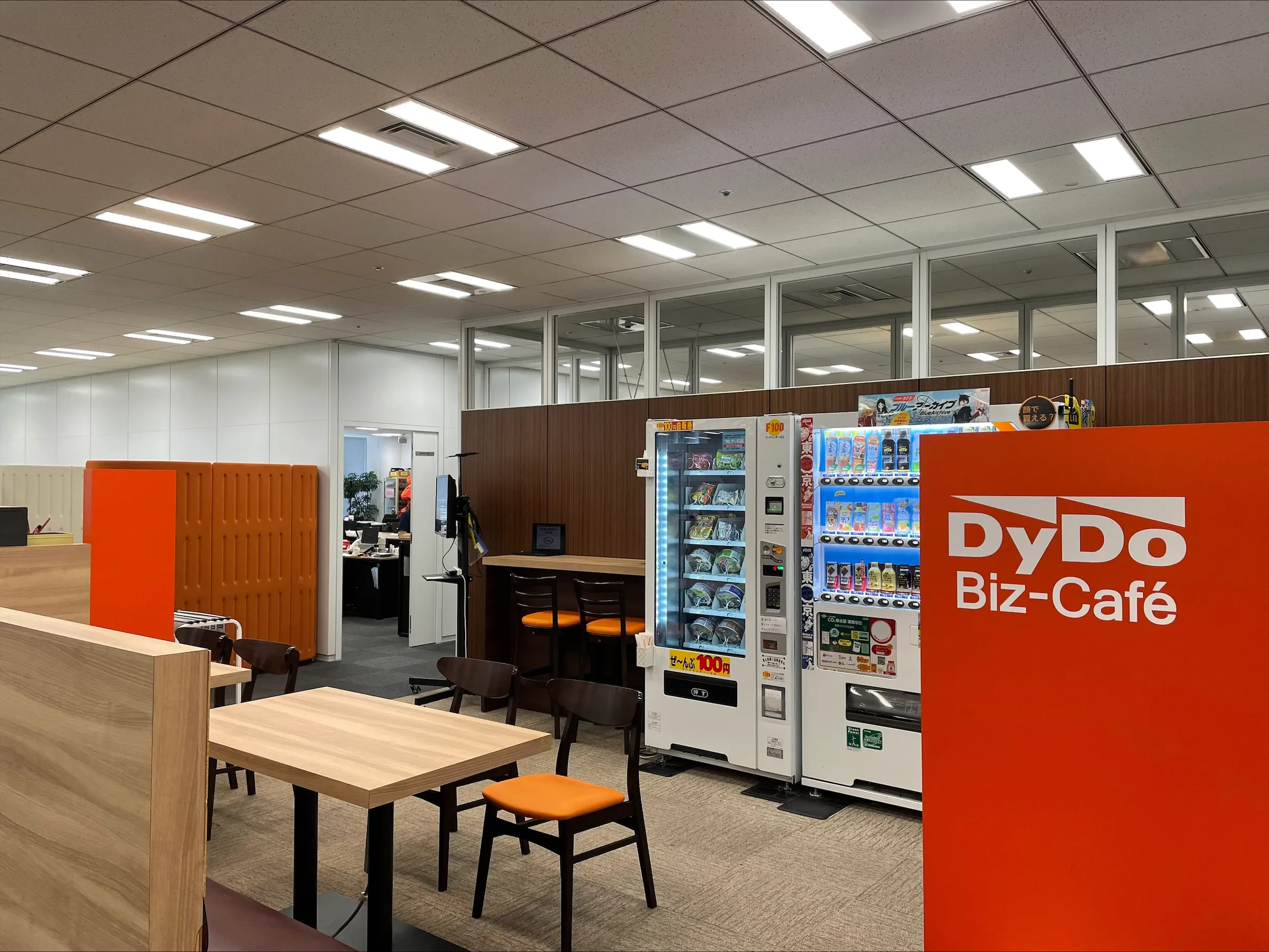 ダイドードリンコの東京本部には、自動販売機を利用したカフェスペースがあります。