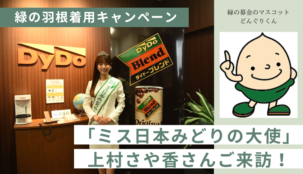 「ミス日本みどりの大使」上村さや香さんがダイドードリンコに来訪されました!(緑の羽根着用キャンペーン)