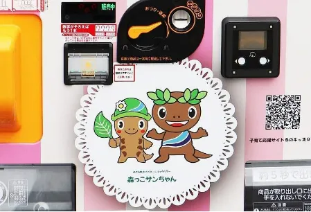 公式キャラクターの『森っ子サンちゃん』をラッピングした子育て支援自販機を設置いたしました。