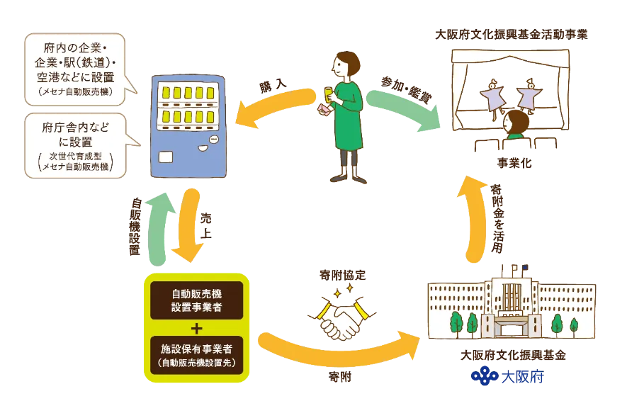 大阪府文化振興基金や、次世代育成型メセナ自動販売機の仕組みについて発信しています。