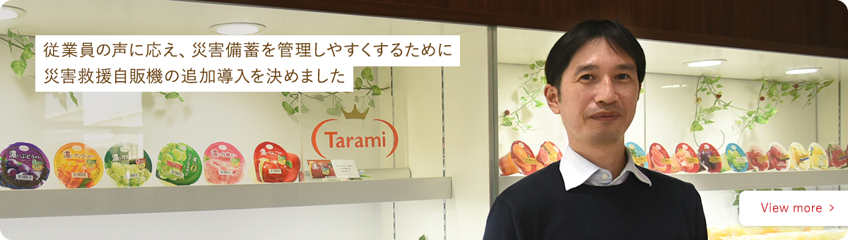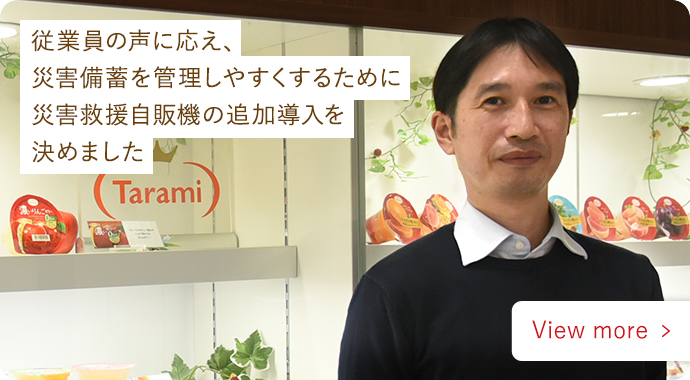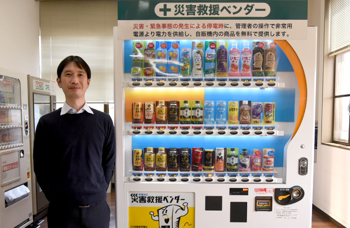 元々、災害救援自販機があるということはHPや冊子などで知っていました。停電があった後に福利厚生の面で、自販機を1台増設する検討をしていたので、それであれば災害時でも利用できるものをと設置をお願いしました。