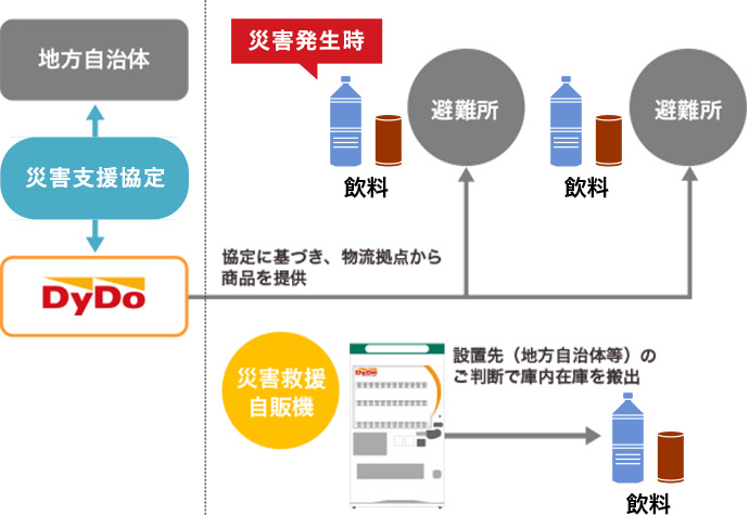 当社が指定する物流拠点および災害救援自販機の在庫商品を無償で提供することをお約束しています。