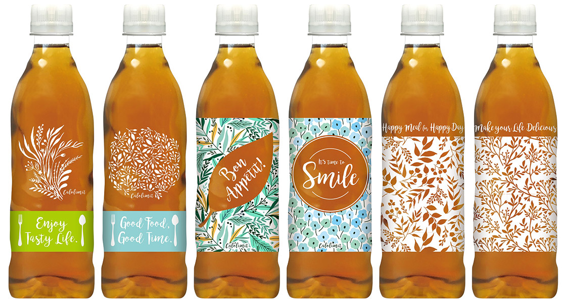 原材料や栄養成分表示を外装箱にのみ記載し、商品パッケージは全面デザインを採用。食事がよりおいしく、楽しくなるデザインに仕上げました。ランチョンマットなどの食に関わるアイテムをイメージしたいつもの食事を華やかに演出するデザインで、「食事をもっと楽しく!」します。厳選した5種のお茶素材である、はとむぎ、緑茶、ほうじ茶、烏龍茶、コーンをブレンド。そこに「大人のカロリミット®」のサプリメント素材であるギムネマシルベスタ、桑の葉、鳩龍緑茶、ブラックジンジャーの4種を配合。香ばしさが食事との相性がよく、すっきり飲みやすいヘルシーな味わいに仕上げました。<全6種類のデザイン>