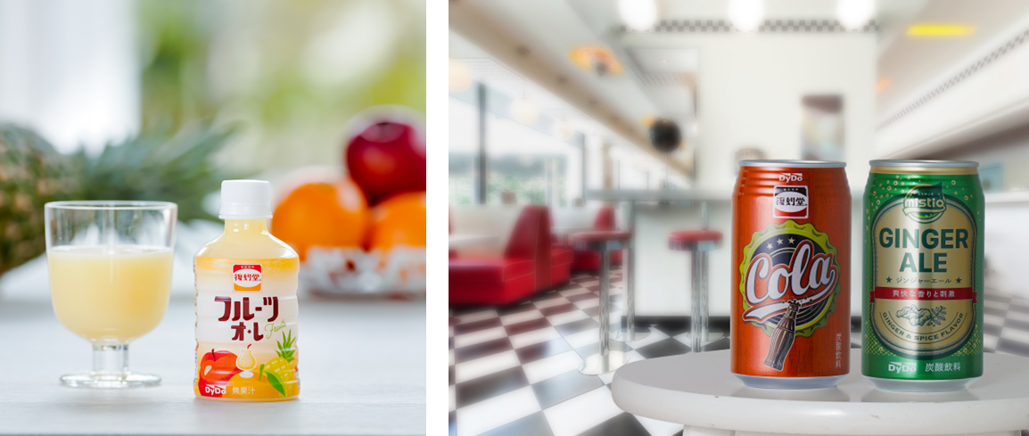 この度「復刻堂」ブランドから2023年春夏の新商品として発売する「復刻堂 フルーツオ・レ」は、喫茶店で昔飲んだような「フルーツの果実感」と「まろやかなミルク感」を追求した、昔懐かしいフルーツオ・レです。また、「復刻堂 コーラ」は定番の味わいに仕上げ、適度な酸味と甘味でごくごくお飲みいただけます。