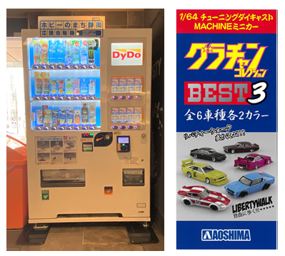本自販機は、日本全国のプラモデル出荷額の80%を超えるシェアを誇る「ホビーのまち」である静岡市の魅力を、自動販売機を通じて発信し、「静岡市」をさらに盛り上げていきたいとの思いで企画したもので、飲料とあわせて株式会社青島文化教材社(本社:静岡市葵区)製のミニカー(価格:1,000円 税込)を購入することできます。本自販機を通じて地域の皆さまやプラモデルファンをはじめ、多くの方々に楽しさと親しみを感じていただければと期待しております。