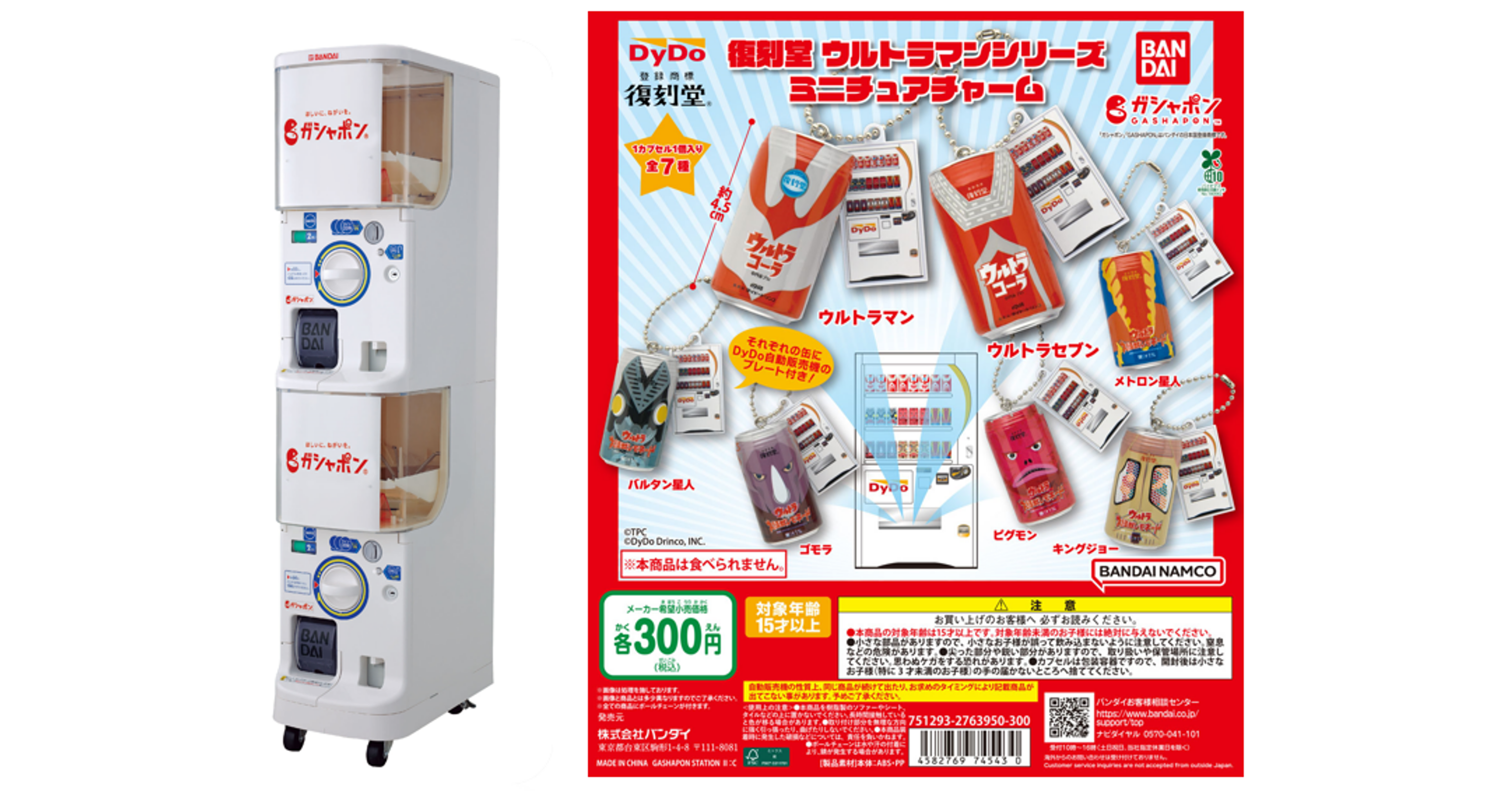 コラボ第二弾は、2010年発売の“復刻堂 ウルトラマンシリーズ”をモチーフにした『復刻堂 ウルトラマンシリーズ ミニチュアチャーム』全7種です。2025年5月第5週より全国のガシャポンバンダイオフィシャルショップ、玩具売場、量販店、家電店などに設置されたガシャポン自販機シリーズにて発売されます。当時の商品をリアルに再現した『復刻堂 ウルトラマンシリーズ ミニチュアチャーム』をぜひお楽しみください。