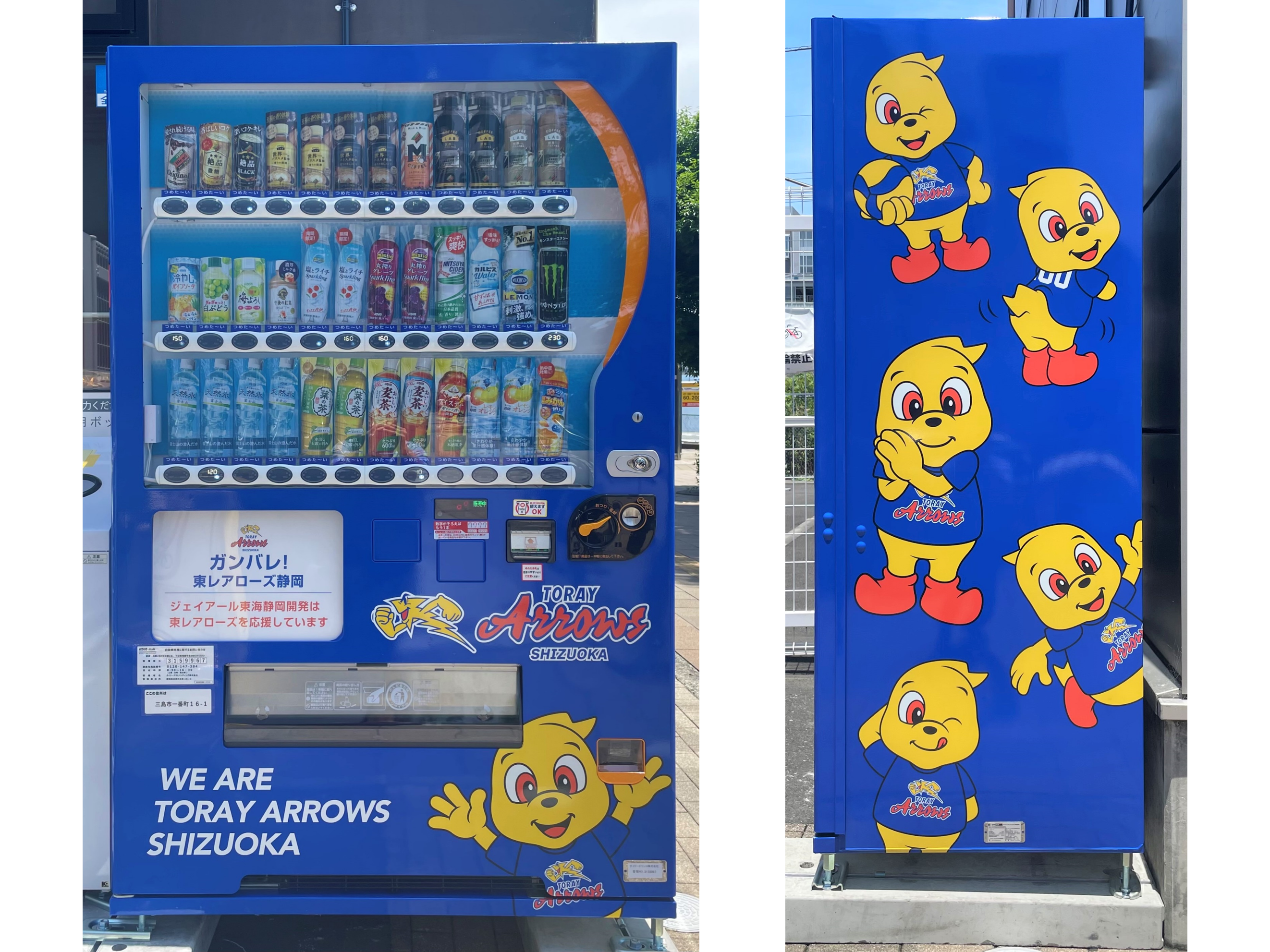東レアローズ静岡をより多くの皆様に親しんでいただき、チームをさらに盛り上げていきたいという思いから、本自販機を企画・設置いたしました。本自販機は、「東レアローズ静岡」の公式マスコットキャラクター「アロッチ」を用いたデザインでラッピングされており、さまざまなポーズの「アロッチ」が描かれています。ご利用いただく皆様に楽しさや親しみを感じていただけるものと期待しております。