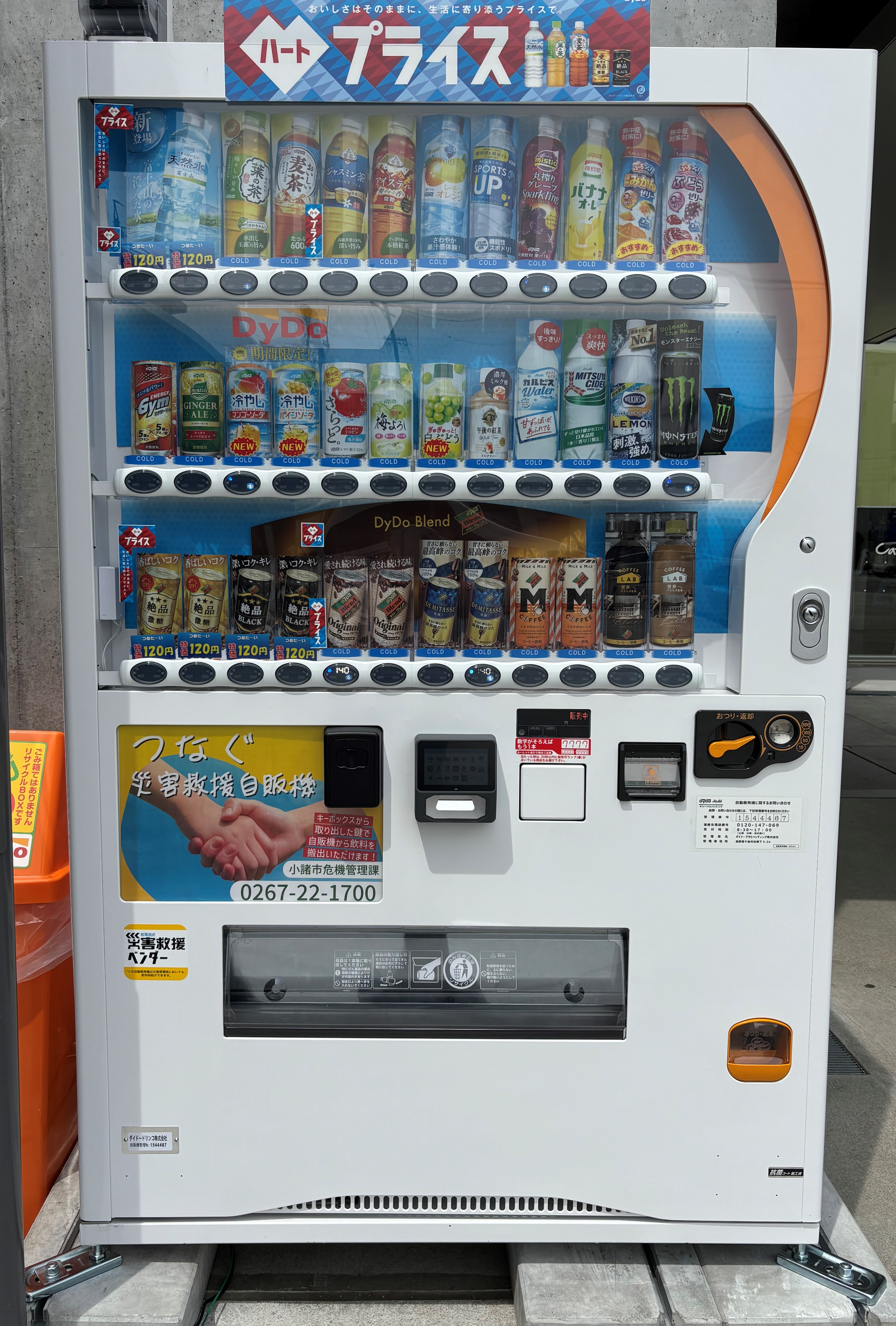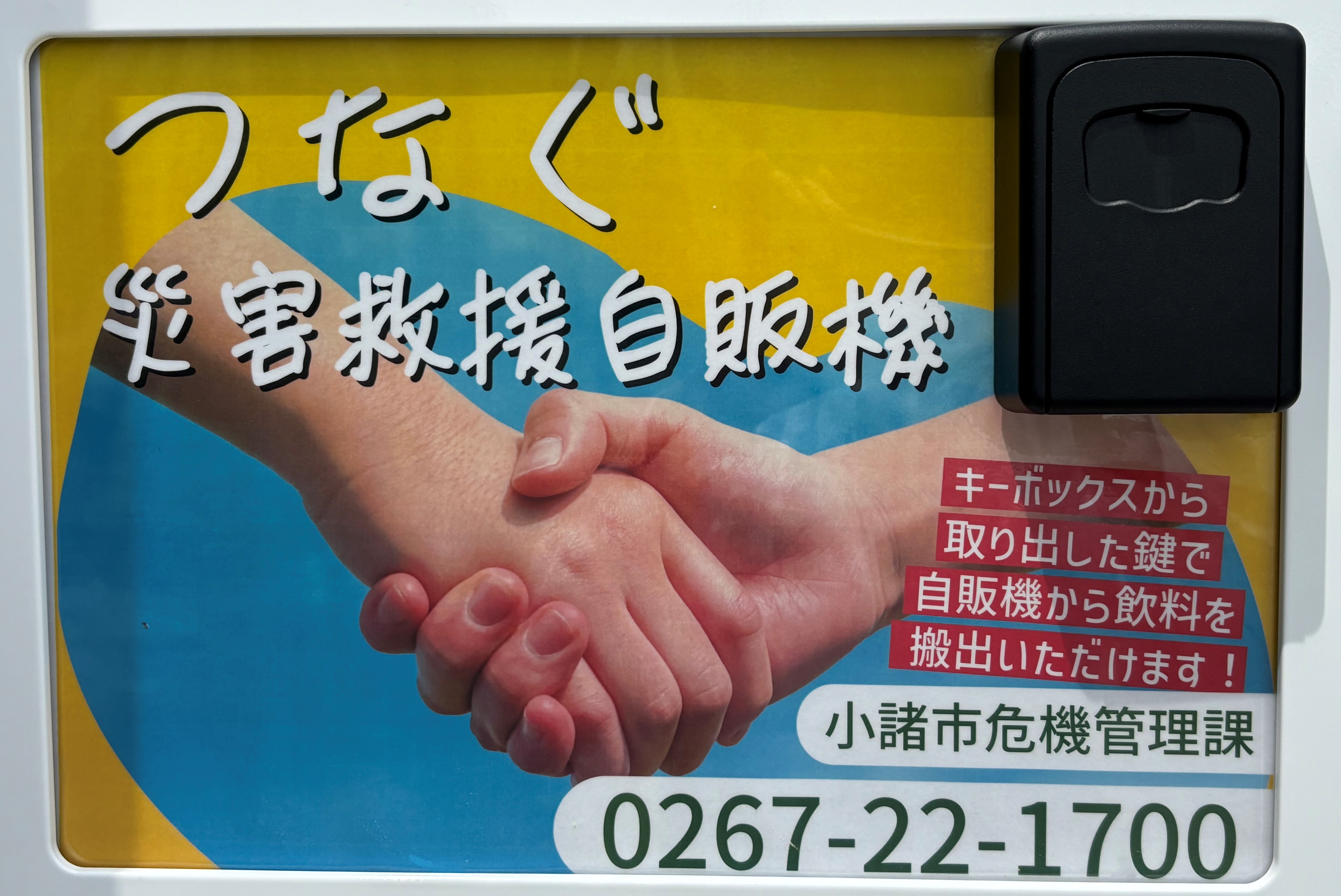 この度、本協定に基づく取り組みの一環として、キーボックスが備え付けられた非常用バッテリー式の「つなぐ災害救援自動販売機」(以下「本自販機」)を5月23日(金)、こもろプラザに設置いたしました。