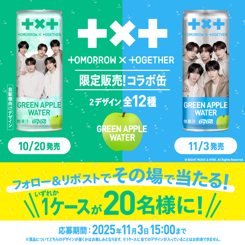 ダイドードリンコ株式会社(本社:大阪市北区、代表取締役社長:中島 孝徳、以下「当社」)は、2025年秋冬の新商品として、「ダイドー TOMORROW X TOGETHER(トゥモローバイトゥギャザー)グリーンアップルウォーター」を、自動販売機では10月20日(月)より、量販店等では11月3日(月)より期間限定で発売※いたします。