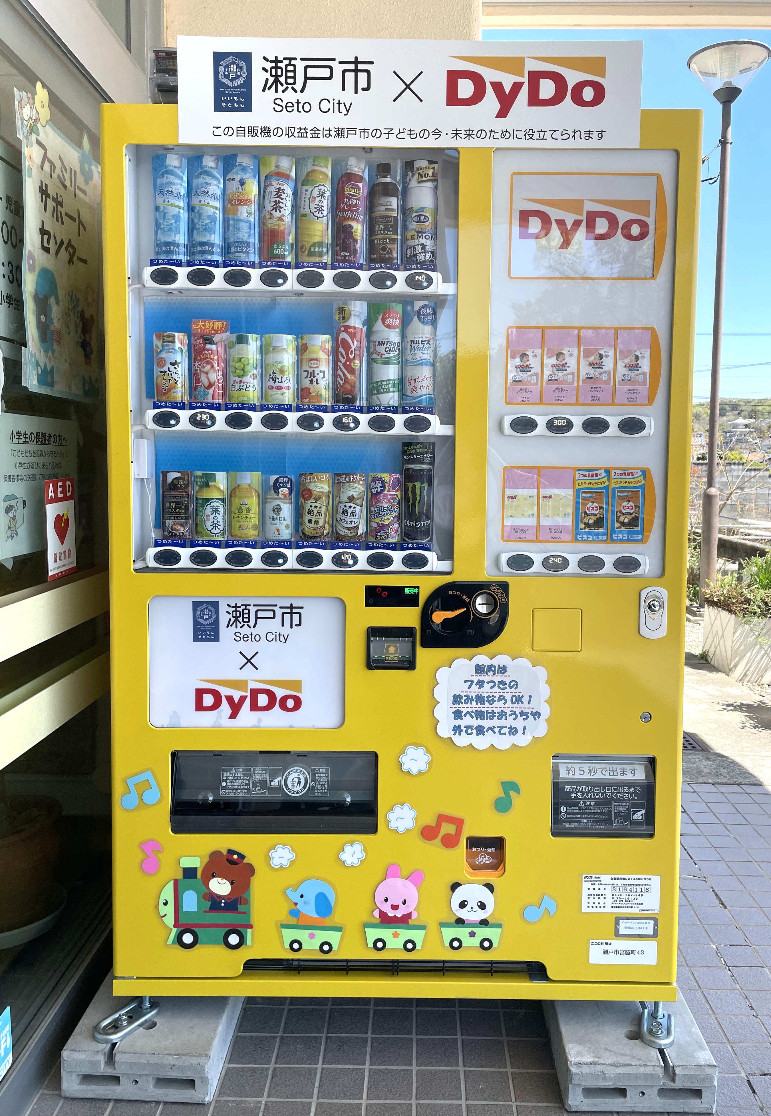 本連携協定に基づく取り組みの一環として、「子ども・子育て応援自動販売機」(以下「本自販機」)をせとっ子ファミリー交流館に設置しました。